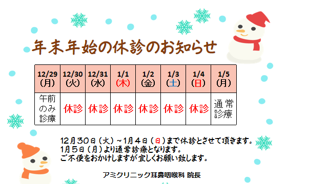 12月30日(火)~1月4日(日)まで休診とさせて頂きます